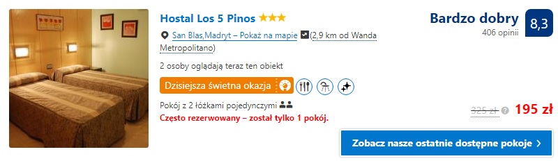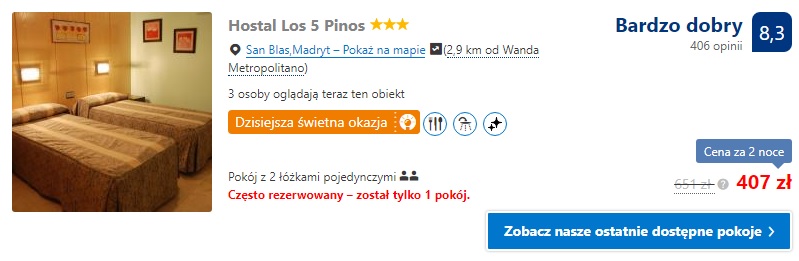 W przypadku dwóch noclegów proponujemy zatrzymać się w obiekcie Hostal Los 5 Pinos położonym blisko stadionu, gdzie za dwie noce w pokoju dwuosobowym zapłacimy 407 zł ( ok. 102 zł os./noc). W tym samym obiekcie za jedną noc w pokoju dwuosobowym 195 zł ( ok. 98 zł os./noc).