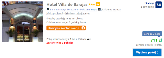 Oferujemy pobyt w Hotel Villa de Barajas. Koszt noclegu w dniach 23-25 listopada w pokoju dwuosobowym wynosi 711 zł (178 zł os./noc). Dla fanów, którzy wybierają się do Madrytu w pojedynkę proponujemy Hotel Osuna Feria Madrid. Za pokój jednoosobowym w tym samym terminie zapłacimy 559 zł.