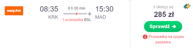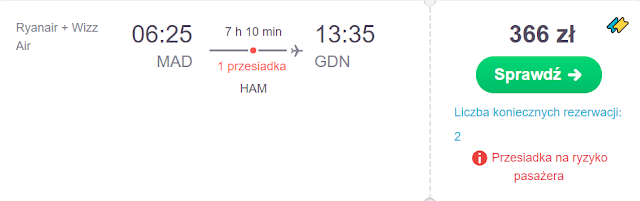 Lot powrotny warto zarezerwować na 25 listopada. Z Madrytu do Warszawy Modlin dotrzemy za 298 zł REZERWUJ====>. Alternatywą jest połączenie do Gdańska (z przesiadką w Hamburgu) za 323 zł* (cena regularna 366 zł) REZERWUJ====> oraz Poznania (z przesiadką w Londyn Stansted) za 234 zł REZERWUJ====>.