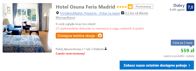 Oferujemy pobyt w Hotel Villa de Barajas. Koszt noclegu w dniach 23-25 listopada w pokoju dwuosobowym wynosi 711 zł (178 zł os./noc). Dla fanów, którzy wybierają się do Madrytu w pojedynkę proponujemy Hotel Osuna Feria Madrid. Za pokój jednoosobowym w tym samym terminie zapłacimy 559 zł.