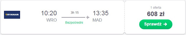 Proponujemy dwa bezpośrednie połączenia lotnicze z Madrytem w dniu 31.08. Pierwsza możliwość to lot z Wrocławia za 608 zł REZERWUJ====>, inna opcja to przelot z lotniska Warszawa-Modlin za 726 zł REZERWUJ====>