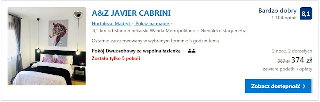 Tradycyjnie już wskazujemy dwie możliwości noclegowe na pobyt w stolicy Hiszpanii. Tańsza z nich to A&Z Javier Cabrini za 374 zł (94 zł/os/noc). Inna opcja, nieco droższa to nocleg w Hotel Barajas Plaza za 430 zł (108 zł/os/noc).