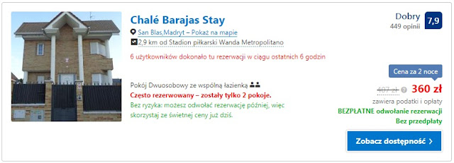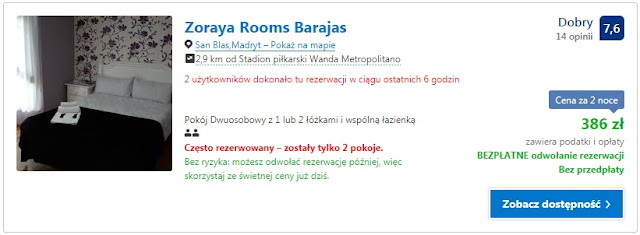 Inna możliwość na noclegi w Madrycie to Zoraya Rooms Barajas, w którym zapłacimy 386 zł (97 zł/os/noc).