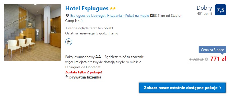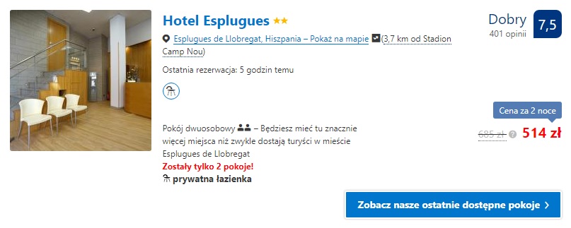 Proponujemy pobyt w Hotel Esplugues gdzie za dwie noce w pokoju dwuosobowym zapłacimy 514 zł ( ok. 129 zł/os./noc), a w przypadku trzech noclegów w pokoju dwuosobowym zapłacimy 771 zł ( ok. 129 zł/os./noc)