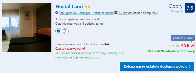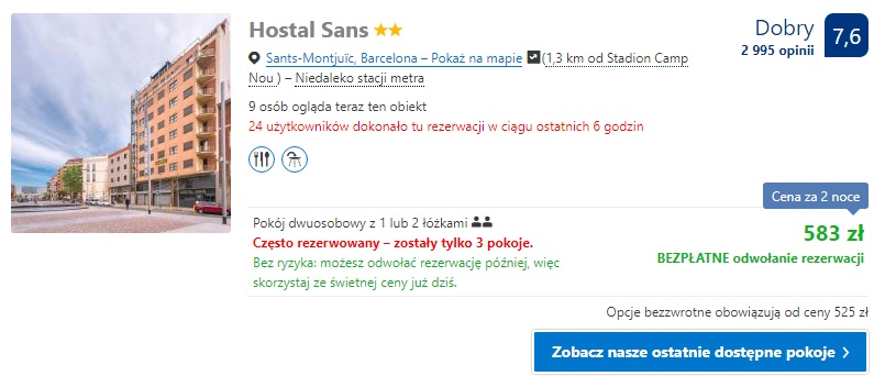 Proponujemy nocleg w obiektach położonych niedaleko Camp Nou. Pierwszym jest Hostal Lami , gdzie za 2 noce w pokoju dwuosobowym zapłacimy 466 zł(ok. 117 zł/os./noc). Drugą propozycją jest nieco droższy Hostal Sans, znajdujący się znacznie bliżej stadionu. Za dwie noce w pokoju dwuosobowym zapłacimy ok. 537 zł(bez możliwości odwołania rezerwacji ok.135 zł/os./noc) lub 596 zł(z możliwością odwołania, 149 zł/os./noc).
