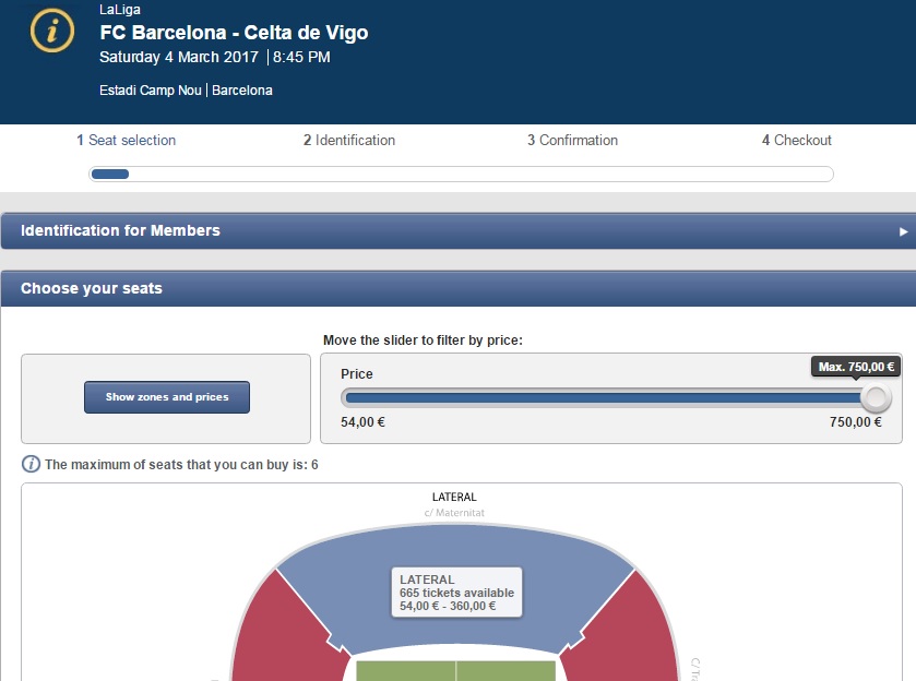 Bilety na mecz do kupienia na oficjalnej stronie FC Barcelony => https://tickets-fcb.fcbarcelona.com/fcbarcelona/en_US/entradas/evento/6678/session/375943/step1r2?_ga=1.205781267.1815861700.1482182502 od 56,5€ (ok.249zł, wraz z opłatami manipulacyjnymi).