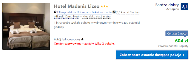 Proponujemy obiekty znajdujące w promieniu kilometra od stadionu Camp Nou. Pierwszy z nich to Senator Barcelona Spa Hotel, w którym za nocleg w dniach 1-3 lutego zapłacimy 687 zł za jedną oraz 783 zł (196 zł os./noc) za dwie osoby. Alternatywą może być Hotel Madanis Liceo. Tutaj koszt pobytu w tym samym terminie wynosi 608 zł w pokoju jedno i 685 zł (ok. 171 zł os./noc) w pokoju dwuosobowym.