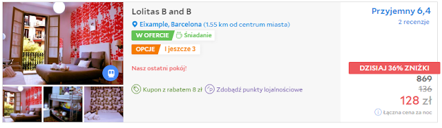 Proponujemy nocleg w Lolitas B nad B gdzie za pokój dwuosobowy z jednym łóżkiem i śniadaniem w cenie zapłacimy 256 zł za dwa noclegi (128 zł za osobę za dwie noce) lub w obiekcie Coronado gdzie za pokój dwuosobowy (również opcja dwóch pojedynczych łóżek) zapłacimy 246 zł za dwie noce (123 zł za osobę za dwa noclegi). Oba obiekty znajdują się w promieniu 4 km od Camp Nou.