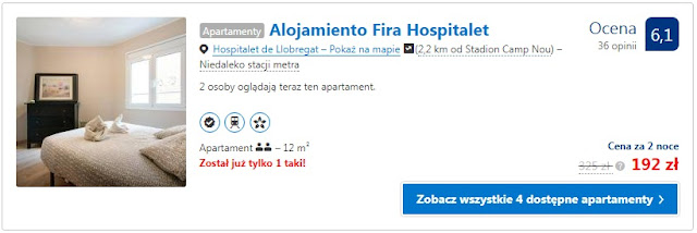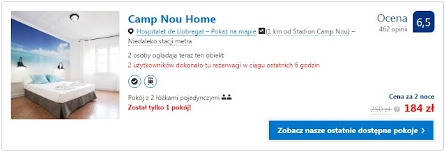 Pomimo dość gorącego terminu na pobyt w Barcelonie proponujemy dwie opcje noclegów nieopodal Camp Nou. Pierwsza z nich to Camp Nou Home, gdzie dwie noce dla dwóch osób kosztują 184 zł (46 zł/os/noc). Inna możliwość to nieznacznie droższe Alojamiento Fira Hospitalet, tutaj za dwie nocy zapłacimy 192 zł (48 zł/os/noc).