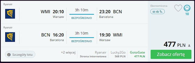 Proponujemy opcje przelotów w obie strony na linii Warszawa-Barcelona. Pierwsza opcja to bezpośrednie loty pomiędzy tymi miastami w dniach 10 i 12 lutego, za które zapłacimy 477 zł REZERWUJ====>