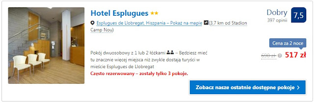 Pobyt na dwie noce proponujemy w okolicach stadionu Camp Nou, cena w obu propozycjach to różnica przede wszystkim w dostępności do prywatnych przestrzeni (m.in. łazienki). Pierwsza możliwość to Cool & Chic Hostel za 465 zł (116 zł/os/noc). Inna, droższa opcja to Hotel Esplugues za 517 zł (129 zł/os/noc).