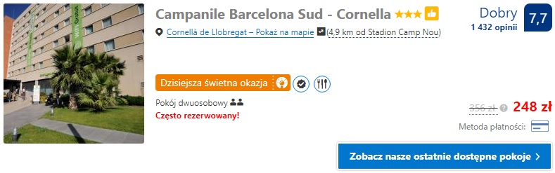 Zarówno w przypadku jednego jak i dwóch noclegów proponujemy zatrzymać się w Campanile Barcelona Sud – Cornella gdzie za dwie noce w pokoju dwuosobowym zapłacimy ok. 504 zł ( ok. 126 zł os./noc- w cenę wliczyliśmy podatek miejski). W przypadku jednego noclegu za pokój dwuosobowy, w tym samym obiekcie zapłacimy połowę mniej.