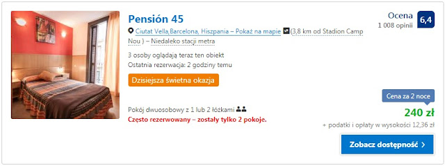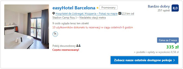 Na pobyt na dwie noce dla dwóch osób polecamy dwa obiekty położone nieopodal stadionu. Za noclegi w Pension 45 zapłacimy 240 zł (60 zł/os/noc), natomiast pobyt w easyHotel Barcelona to koszt 335 zł (84 zł/os/noc).