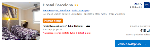 Nieco bliżej do boiska Dumy Katalonii będziemy mieli wybierając obiekt Hostal Barcelona. Za pobyt w terminie 17-19 grudnia zapłacimy 295 zł za jedną oraz 418 zł za dwie osoby (104,5 zł os./noc).