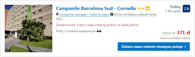 Na jedną noc w Barcelonie polecamy dwie opcje noclegowe dla dwóch osób, pierwsza z nich to Rua Suites za 319 zł (160 zł/os/noc). Inna możliwość noclegowa to Campanile Barcelona Sud-Cornella za 371 zł (186 zł/os/noc).