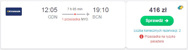 Inna opcja to wylot dzień przed meczem 19.04, wówczas podróż dotyczy przelotu z Gdańska do Barcelony (przez Sztokholm Skavsta), za który zapłacimy 416 zł REZERWUJ====>