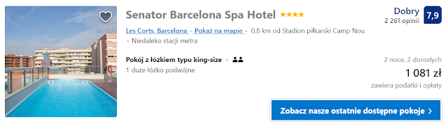 Oferujemy obiekty znajdujące się w promieniu kilometra od stadionu Camp Nou. Pierwszy z nich to Senator Barcelona Spa Hotel, w którym za dwudniowy pobyt zapłacimy 995 zł za jedną oraz 1081 zł za dwie osoby (ok. 270,5 zł os./noc).