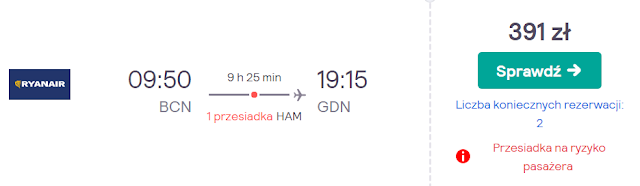 Hiszpanię opuszczamy 30 października. Do wyboru mamy loty przesiadkowe do Warszawy Modlin za 370 zł (z przesiadką w Mediolanie) REZERWUJ====> oraz Gdańska za 391 zł (z przesiadką w Hamburgu) REZERWUJ====> lub bezpośrednio do Krakowa za 681 zł REZERWUJ====> i Warszawy za 682 zł REZERWUJ====>.