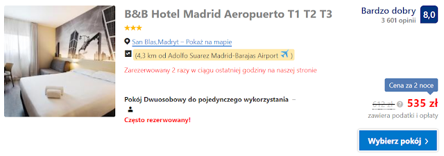 Polecamy obiekt B&B Hotel Madrid Aeropuerto T1 T2 T3, w którym dwudniowy nocleg kosztuje 535 zł za jedną oraz 562 zł za dwie osoby (281 zł os./noc).