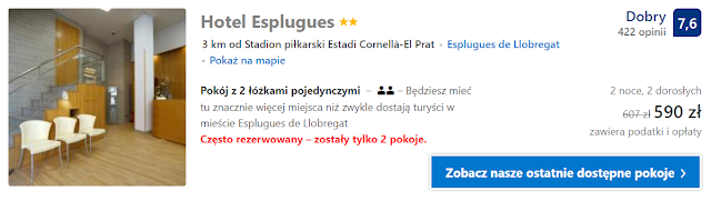 Proponujemy Hotel Esplugues, gdzie za dwudniowy nocleg w pokoju jednoosobowym zapłacimy 465 zł* zaś za dwuosobowy 598 zł* (149,5 zł os./noc).