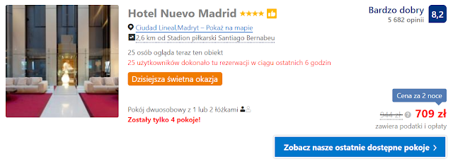 Polecamy Hotel Nuevo Madrid, gdzie nocleg w dniach 1-3 marca będzie kosztować nas 709 zł (ok. 178 zł os./noc).