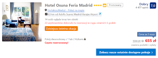 Obiektem, który znajduje się bliżej lotniska w Madrycie jest Hotel Osuna Feria Madrid. Tutaj koszt pobytu w tym samym terminie wynosi 633 zł za jedną oraz 695 zł za dwie osoby (ok. 174 zł os./noc).