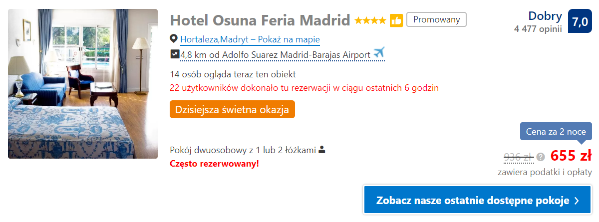Obiektem, który znajduje się bliżej lotniska w Madrycie jest Hotel Osuna Feria Madrid. Tutaj koszt pobytu w tym samym terminie wynosi 633 zł za jedną oraz 695 zł za dwie osoby (ok. 174 zł os./noc).