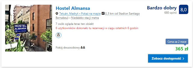 Proponujemy pobyt w dwóch miejscach nieopodal Estadio Santiago Bernabeu. Pierwsza opcja to Hostel Almansa, gdzie dwie noce dla dwóch osób to koszt 365 zł (ok. 92 zł/os/noc). Inna możliwość to pobyt w San Bernardo Rooms, który kosztuje 415 zł (ok. 104 zł/os/noc).