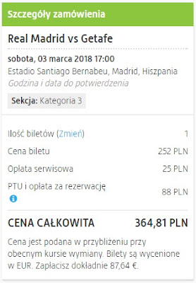 Bardzo prawdopodobne, że na stronie Realu Madryt w późniejszym terminie (na dzień dzisiejszy nieokreślonym – nie ma konkretnej daty) pojawią się bilety w otwartej sprzedaży. Obecnie wejściówki dostępne są za pośrednictwem rynku wtórnego. Za bilet zapłacimy już od ok. 365 zł, a zakupioną wejściówkę otrzymamy za pośrednictwem poczty elektronicznej REZERWUJ====>