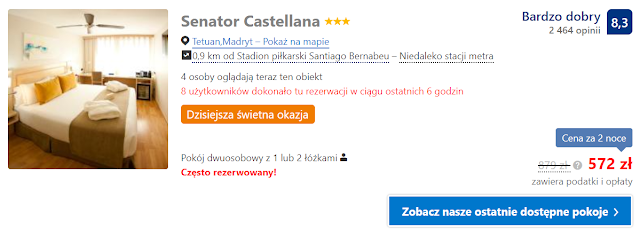 Innym godnym uwagi miejscem jest Senator Castellana. Tutaj za pobyt w pokoju jednoosobowym zapłacimy 572 zł oraz 649 zł za dwuosobowy (ok. 163 zł os./noc).