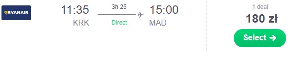 Wylot proponujemy dzień przed meczem z Warszawy do Madrytu za 85 zł REZERWUJ ==== >, z Wrocławia za 85 zł REZERWUJ ==== > lub Krakowa za 180 zł REZERWUJ ==== > . Istnieje również możliwość wylotu w dniu meczu z Warszawy za 234 zł REZERWUJ ==== >