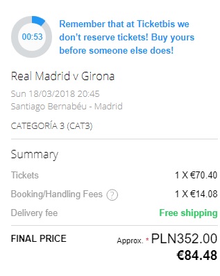 Bardzo prawdopodobne, że na stronie Realu Madryt w późniejszym terminie (na dzień dzisiejszy nieokreślonym – nie ma konkretnej daty) pojawią się bilety w otwartej sprzedaży. Obecnie wejściówki dostępne są za pośrednictwem rynku wtórnego. Za bilet zapłacimy już od ok. 352 zł (cena na stronie może różnić się nieznacznie, zależy to od kursu walut w danym banku)REZERWUJ ==== >. Wejściówkę otrzymamy w formie e-biletu.