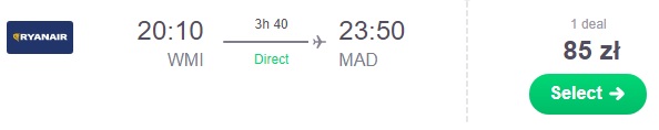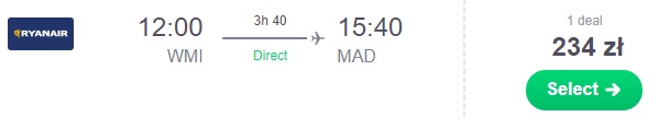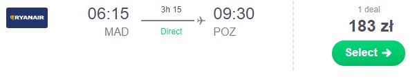 Lot powrotny proponujemy zarezerwować dzień po meczu z Madrytu do Warszawy za 277 zł REZERWUJ ==== >, lub z Madrytu do Poznania za 183 zł REZERWUJ ==== >. Istnieje możliwość lotów łączonych z Madrytu do Birmingham za 84 zł REZERWUJ ==== > a następnie z Birmingham do Wrocławia za 93 zł* (cena regularna 128 zł) REZERWUJ ==== >