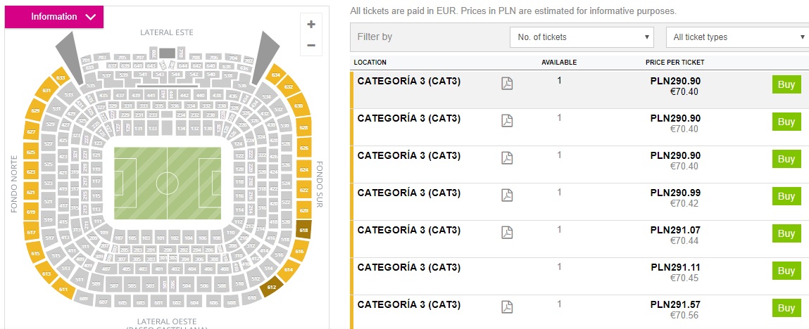 Bardzo prawdopodobne, że na stronie Realu Madryt w późniejszym terminie (na dzień dzisiejszy nieokreślonym – nie ma konkretnej daty) pojawią się bilety w otwartej sprzedaży. Obecnie wejściówki dostępne są za pośrednictwem rynku wtórnego. Za bilet zapłacimy już od ok. 352 zł (cena na stronie może różnić się nieznacznie, zależy to od kursu walut w danym banku)REZERWUJ ==== >. Wejściówkę otrzymamy w formie e-biletu.