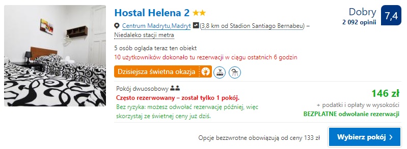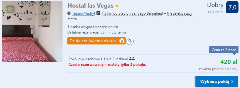 Proponujemy nocleg w obiekcie położonym w doskonałej lokalizacji jakim jest Hostal Las Vegas gdzie za dwie noce w pokoju dwuosobowym zapłacimy 420 zł ( 105 zł/ os./ noc). W przypadku jednego noclegu polecamy Hostal Helena 2 gdzie za noc w pokoju dwuosobowym zapłacimy 146 zł (73 zł/ os./noc)