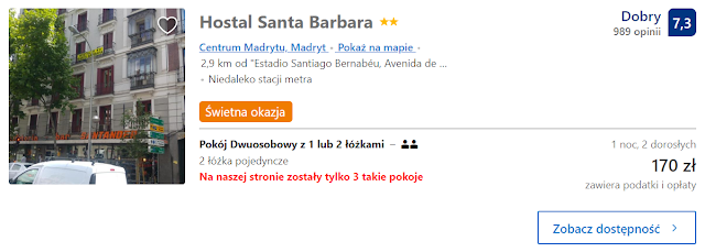 Oferujemy nocleg w terminie 16-17 lutego w Hostal Santa Barbara. Koszt pobytu w pokoju dwuosobowym wynosi 170 zł (85 zł os./noc).
