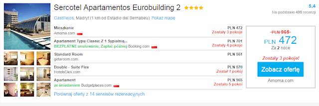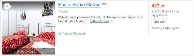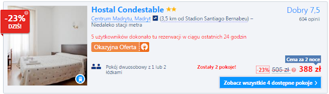Na jeden lub dwa noclegi w Madrycie proponujemy poniższe obiekty  – ceny za 2 noce wahają się od 388-472 zł za pokój dwuosobowy (od 97 zł za osobę za nocleg):