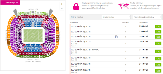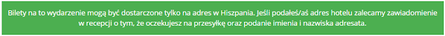 Bilety na obecną chwilę dostaniemy już od 254 zł zarezerwuj TUTAJ====>. Jak informuje portal bilety będą dostarczane na terenie Hiszpanii za darmo – w przypadku podania adresu hotelowego sugerują wcześniejsze  powiadomienie recepcji. Adres można dodać najpóźniej 5 dni przed datą wydarzenia.