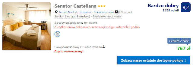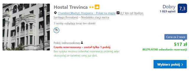 Proponujemy obiekty, które są zlokalizowane nieopodal Estadio Santiago Bernabeu. Pierwszy z nich to Hostal Trevinca. Koszt pobytu w dniach 2-4 listopada w pokoju jednoosobowym wynosi 517 zł. W przypadku jeśli nie jedziemy sami na mecz oferujemy Senator Castellana. Za nocleg w tym samym terminie w pokoju dwuosobowym zapłacimy 767 zł (ok. 192 zł os./noc).