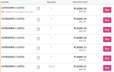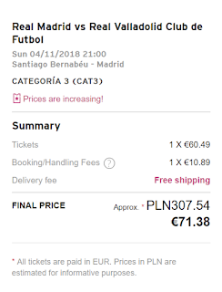 Prawdopodobnie na kilka dni przed meczem bilety powinny pojawić się w otwartej sprzedaży na oficjalnej stronie Realu Madryt ,a ich cena powinna być niższa od biletów dostępnych na rynku wtórnym. Na dzień dzisiejszy proponujemy skorzystania z rynku wtórnego. Koszt biletów wraz z opłatami manipulacyjnymi zaczyna się od 71 EUR (ok. 308 zł) REZERWUJ====>