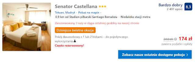 Dla kibiców reflektujących nocleg bliżej Estadio Santiago Bernabeu polecamy oddalony o 600 metrów od stadionu Senator Castellana. Tutaj pobyt w pokoju jednoosobowym kosztuje 174 zł oraz 213 zł za pokój dwuosobowy (106,5 zł os./noc).