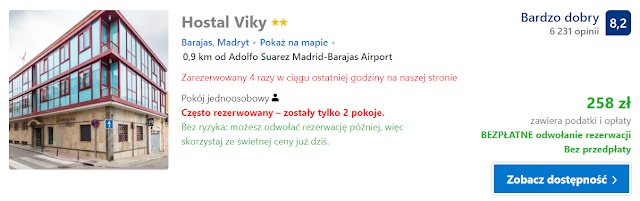 Oferujemy pobyt w obiektach znajdujących się promieniu kilometra od newralgicznych miejsc. Pierwszy z nich to Hostal Viky, w którym za jednodniowy nocleg zapłacimy 258 zł za jedną oraz 280 za dwie osoby (140 zł os./noc).