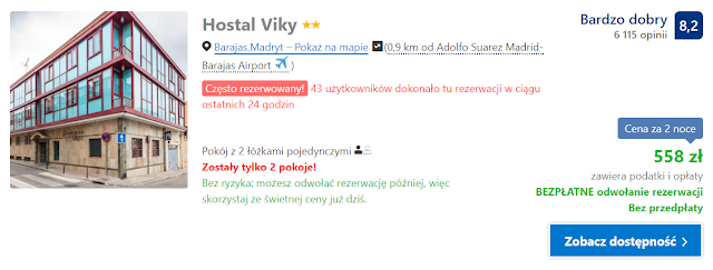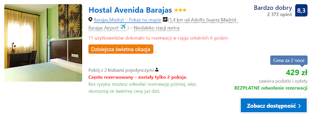 Oferujemy pobyt w dniach 18-20 stycznia w Hostal Avenida Barajas, gdzie za nocleg zapłacimy 429 zł za jedną oraz 515 zł (ok. 129 zł os./noc) za dwie osoby. Alternatywą może być Hostal Viky. Cena za pokój dwuosobowy w tym obiekcie wynosi 558 zł (ok. 140 zł os./noc).