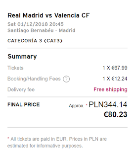 Bilety można zarezerwować przez oficjalną stronę Realu Madryt, aczkolwiek ze względu na ceny proponujemy zakup za pośrednictwem rynku wtórnego. Najtańsze wejściówki wraz z dodatkowymi opłatami są warte 80 EUR (ok. 344 zł) REZERWUJ====>. Być może w późniejszym terminie na oficjalnej stronie Realu pojawią się nieco tańsze bilety, ale ich pula może być znacznie ograniczona.