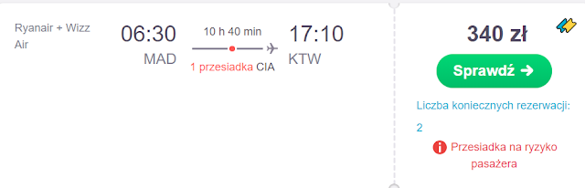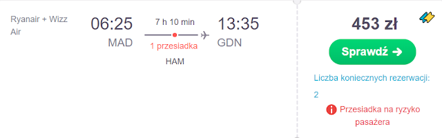 Alternatywą pozostaje lot z Madrytu do Katowic (z przesiadką w Rzym Ciampino) za 296 zł* (cena regularna 340 zł) REZERWUJ====> oraz do Gdańska (z przesiadką w Hamburgu) za 438 zł* (cena regularna 453 zł) REZERWUJ====>.