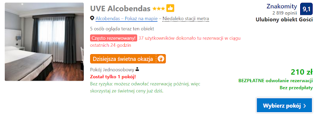 Dla kibiców, którzy przylecą do Madrytu 1 grudnia proponujemy UVE Alcobendas, gdzie za nocleg w dniach 1-2 grudnia zapłacimy 210 zł za pokój jednoosobowy oraz 407 zł (203,5 zł os./noc) za dwuosobowy wraz ze śniadaniem.