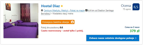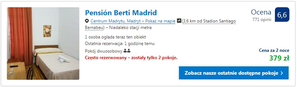 Noclegi podczas pobytu proponujemy w dwóch miejscach położonych nieopodal Santiago Bernabeu. Za dwie noce dla dwóch osób w Pension Berti Madrid i Hostal Diaz zapłacimy 379 zł (ok. 95 zł/os/noc).