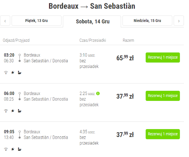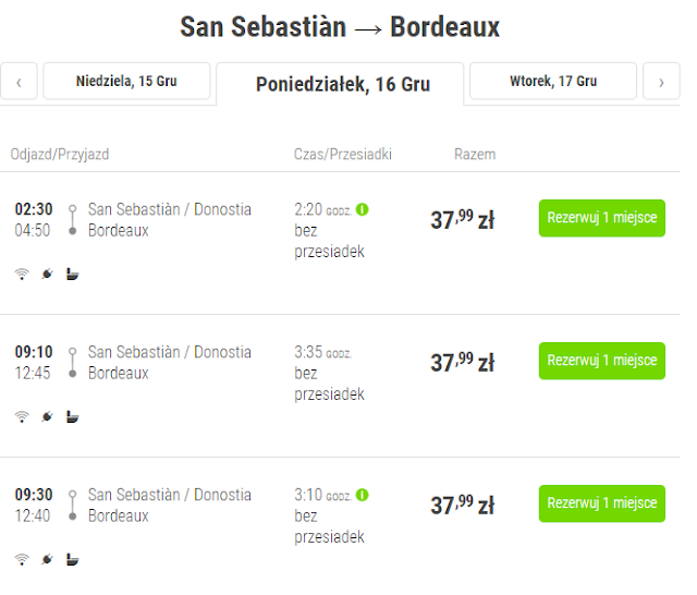 Z Bordeaux do San Sebastian dotrzemy Flixbusem w dniach 14-16 grudnia od 76 zł za podróż w dwie strony REZERWUJ====>. Ze względu na późną porę przylotu w piątek 13 grudnia do Baskonii udajemy się dopiero w dniu meczu, a pierwszy nocleg rezerwujemy we Francji.