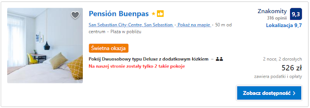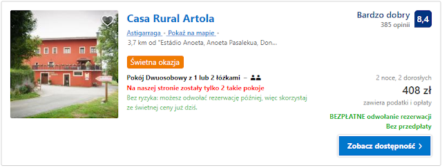 W docelowym mieście naszej podróży, czyli San Sebastian możemy zatrzymać się w okolicach Estadio Anoeta w obiekcie Casa Rural Artola. Za pobyt w tym miejscu w dniach 14-16 grudnia zapłacimy 408 zł za jedną/dwie osoby.
