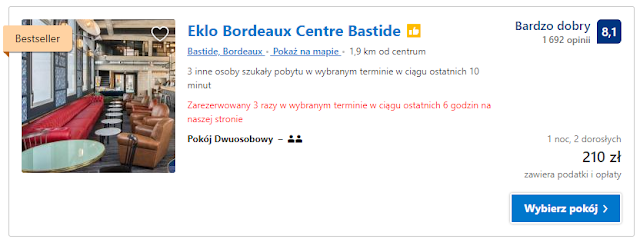 Na pierwszą noc z konieczności musimy zatrzymać się w Bordeuax, a dobrą i tanią opcją będzie hotel Eklo Bordeaux Centre Bastide. Za nocleg w tym obiekcie z 13 na 14 grudnia zapłacimy 210 zł za 1-2 osoby.